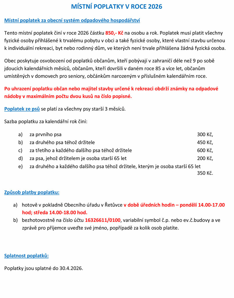Poplatky jsou splatné do 30.4.2026.