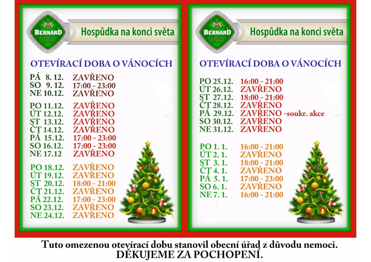 Uveřejňujeme provozní dobu naší Hospůdky na konci světa v prosinci a lednu...